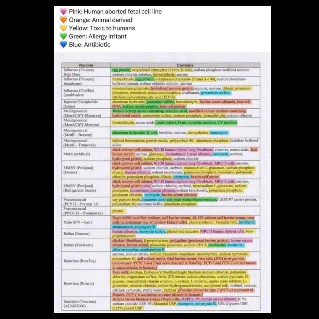 💗 Pink: Human aborted fetal cell line🟠 Orange: Animal derived💛 Yellow: Toxic to humans💚 Green: Allergy irritant💙 Blue: Antibioticdi V Nin ENsu Pubblicato il 11/09/202511/09/2025 FacebookShare on XLinkedInWhatsAppEmailCopy Link