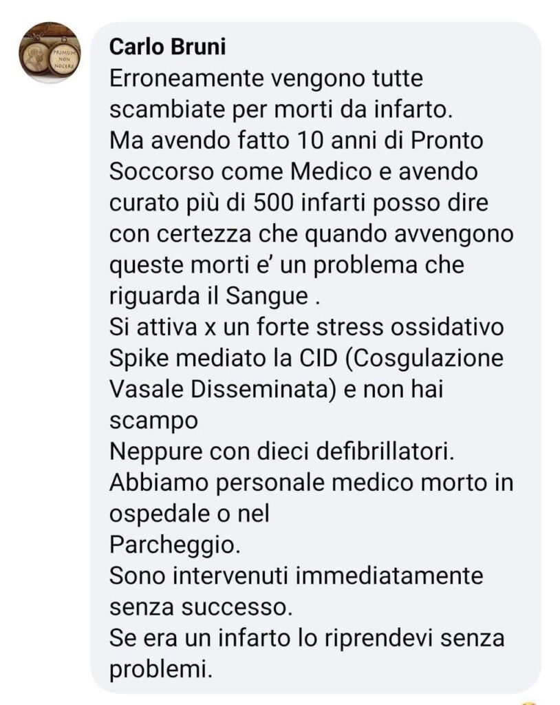 Carlo Bruni: Erroneamente vengono tutte scambiate per morti da infarto. Ma avendo fatto 10 anni di Pronto Soccorso come Medico e avendo curato più di 500 infarti posso dire con certezza che quando avvengono queste morti è un problema che riguarda il Sangue. Si attiva x un forte stress ossidativo Spike mediato la CID (Cosgulazione Vasale Disseminata) e non hai scampo Neppure con dieci defibrillatori. Abbiamo personale medico morto in ospedale o nel Parcheggio. Sono intervenuti immediatamente senza successo. Se era un infarto lo riprendevi senza problemi.