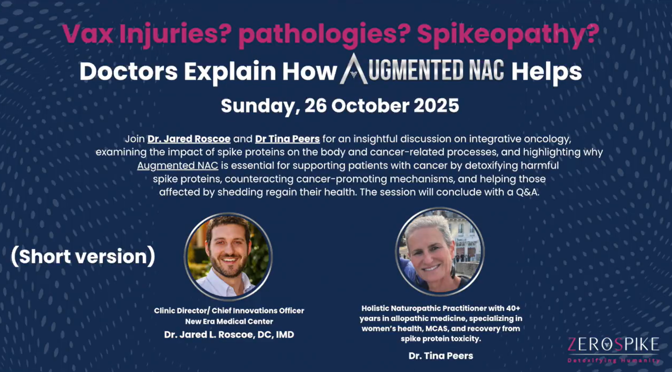 Testimonials All Doctors Patients “I’ve taken hundreds of different supplements, but none of them really did much – Augmented NAC has been a game changer for me.”Michael Oesch “I’ve taken hundreds of different supplements, but none of them really did much – Augmented NAC has been a game changer for me.”Michael Oesch Spike Paralysis Improving: An Update on Michael Oesch Since Why Can’t We Talk About This?Dr John Campbell Spike Paralysis Improving: An Update on Michael Oesch Since Why Can’t We Talk About This?Dr John Campbell What They STILL Aren’t Telling You About Spike Protein – the Fallout We’re Still IgnoringDr Tina Peers in conversation with Russell Brand What They STILL Aren’t Telling You About Spike Protein – the Fallout We’re Still IgnoringDr Tina Peers in conversation with Russell Brand SPIKE PROTEIN, LONG COVID, AND THE SEARCH FOR RELIEFDr Tina Peers & Del Bigtree on the HighWire SPIKE PROTEIN, LONG COVID, AND THE SEARCH FOR RELIEFDr Tina Peers & Del Bigtree on the HighWire Clinical Results of Augmented NAC and Urine Spike Tracing (UST) Clinical Results of Augmented NAC and Urine Spike Tracing (UST) “Spike Proteins, Spikeopathy, Cancer, and Turbo Cancer – Why Augmented NAC Matters” Dr. Jared Roscoe and Dr. Tina Peers “Spike Proteins, Spikeopathy, Cancer, and Turbo Cancer – Why Augmented NAC Matters” Dr. Jared Roscoe and Dr. Tina Peers A 2-year-old almost lost his eye… Augmented NAC, as part of an integrated protocol, saved it in 7 days! 👶👁️Dr. Jared Roscoe A 2-year-old almost lost his eye… Augmented NAC, as part of an integrated protocol, saved it in 7 days! 👶👁️Dr. Jared Roscoe “I have found Augmented NAC superior to other protocols”Dr Anna Forbes UKwww.theforbesclinic.co.uk “I have found Augmented NAC superior to other protocols”Dr Anna Forbes UKwww.theforbesclinic.co.uk Thank you for bringing us our mom back! Thank you for bringing us our mom back! Augmented NAC: Beyond the Spike Protein Detox – Supports Glutamate Regulation and MoreDr Jess Armine Augmented NAC: Beyond the Spike Protein Detox – Supports Glutamate Regulation and MoreDr Jess Armine Augmented NAC: Fantastic Success Against Spikeopathy!Dr. Klinghardt Augmented NAC: Fantastic Success Against Spikeopathy!Dr. Klinghardt Covid “Vaccine” injuries, spike protein and Augmented NAC Dr. Tina Peers and Dr. John Campbell Covid “Vaccine” injuries, spike protein and Augmented NAC Dr. Tina Peers and Dr. John Campbell Spike Shedding Triggers Cytokine Cascade – Rapid Relief with Augmented NACDr Allison Peterswww.wellcenteredwellness.com Spike Shedding Triggers Cytokine Cascade – Rapid Relief with Augmented NACDr Allison Peterswww.wellcenteredwellness.com Dr. rer. nat. Ingrid Brown-Rollfinke presents the health improvements her patients have achieved Dr. rer. nat. Ingrid Brown-Rollfinke presents the health improvements her patients have achieved “Chest pain for 2+ years and red-purple skin color in my lower legs – gone in days” Peter “Chest pain for 2+ years and red-purple skin color in my lower legs – gone in days” Peter “After 51 days I woke up and I was basically healed. It saved my life in 51 days.” Don “After 51 days I woke up and I was basically healed. It saved my life in 51 days.” Don “Je peux enfin dormir… Je n’ai plus ces spasmes dans la tête. C’est la première fois depuis des mois.” Karine “Je peux enfin dormir… Je n’ai plus ces spasmes dans la tête. C’est la première fois depuis des mois.” Karine “I have got my life back!” Lindsay “I have got my life back!” Lindsay Latest promising therapeutic strategies with Augmented NAC Dr. Pierre Kory Latest promising therapeutic strategies with Augmented NAC Dr. Pierre Kory VAX INJURIES, DETOX PROTOCOLS AND AUGMENTED NAC VAX INJURIES, DETOX PROTOCOLS AND AUGMENTED NAC “Not only that it has saved my life…But it improved the quality of my life”Tiffiney “Not only that it has saved my life…But it improved the quality of my life”Tiffiney “Tutte le persone…che ho trattato con la NAC Aumentata sono certamente migliorate.”Dott.ssa Borsari “Tutte le persone…che ho trattato con la NAC Aumentata sono certamente migliorate.”Dott.ssa Borsari “Within 48 hours all my symptoms were gone…” Dr. Denef “Within 48 hours all my symptoms were gone…” Dr. Denef “My heart went from 45% function to 100% healed!I think Augmented NAC saved my life.” Meegan “My heart went from 45% function to 100% healed!I think Augmented NAC saved my life.” Meegan