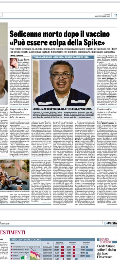 Sedicenne morto dopo il vaccino “Può essere colpa della Spike”di A Din ITsu Pubblicato il 15/09/202216/09/2022 FacebookShare on XLinkedInWhatsAppEmailCopy Link